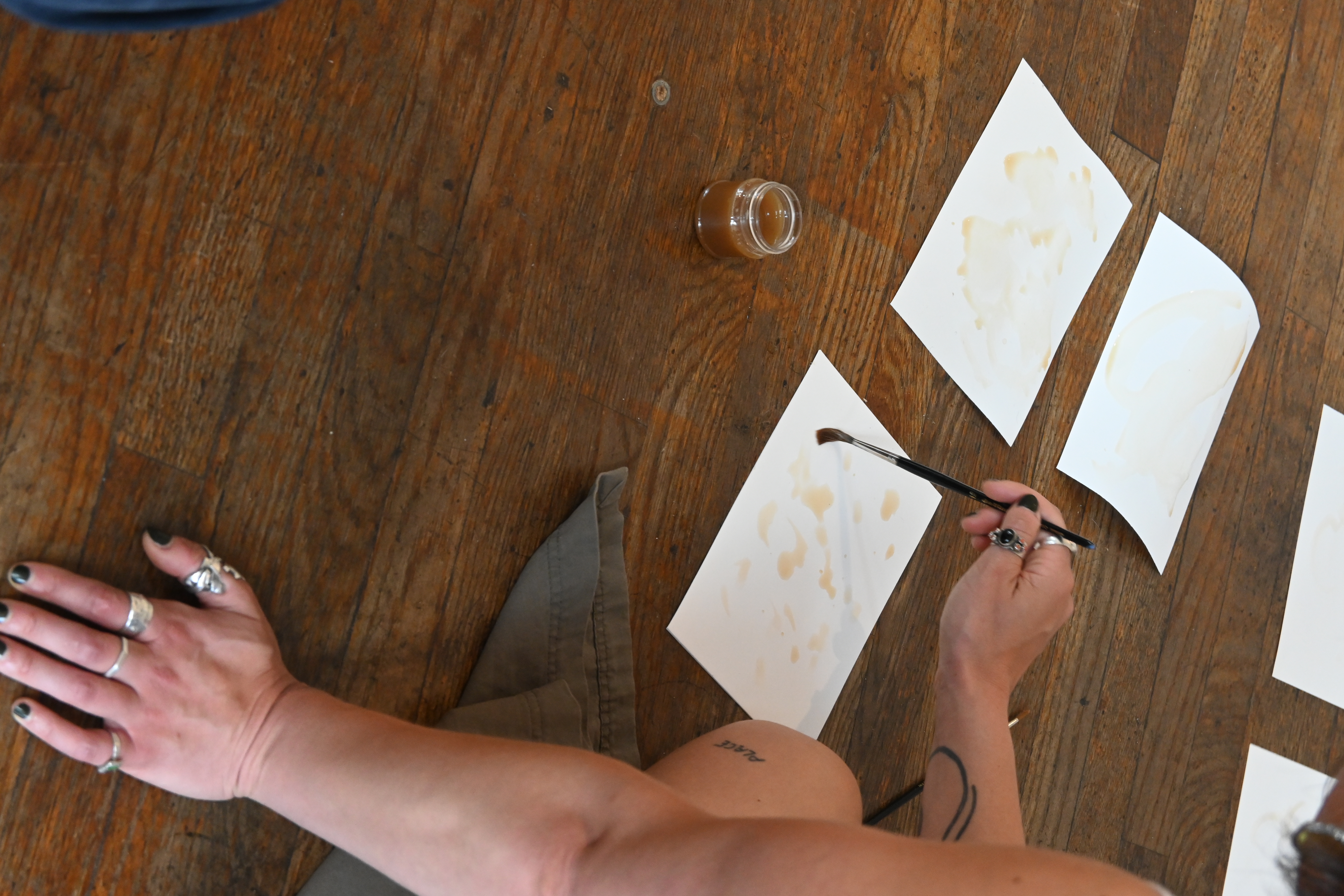 In Becoming Soil, living human bodies came together to co-sense what it is like to relate to non/living matters and materialities. Drawing on principles from the field of Haptonomy (the practice and study of human relationality and the phenomena of touch) participants were invited to make way for a more sensorial encounter with body, soil and death-care. Unfolding in three parts: ‘Noticing’, ‘Being with/in’, ‘Fermenting’, the creative and somatic exercises played with themes such as tenderness, intentionality, attention and affective touch, while also engaging with the exhibition space, works and surrounding landscapes. An audio-recording with site-specific meditation further guided participants to creep, leak and flow through all surrounding material, temporal, fleshy and microbial entanglements after which they gathered in a process of collective processing of the experience. The ink that was used in the creation of the collective work was made from the ferments of decomposing organic matter.